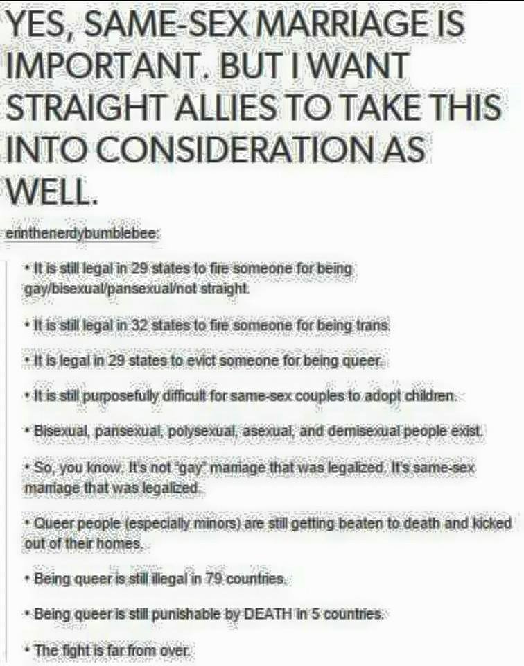 • Continue to make me feel safe. Continue to treat me as one of the girls. Continue to have conversations with me as if I was born genetically / physically female. Continue to be awesome.AND….Share posts like this and others I do. Share the experience and knowledge when you hear someone make a comment you think if I was in earshot of would hurt me. Do not be silent. Do not be passive. There’s a reason people post about being a LGTBQ Ally. No matter what happens legally or socially – our numbers will always be a minority. Stand up and be counted as a friend and ally when you hear something. Stop the ignorance of others. Just because I didn’t hear it myself doesn’t mean it was right to let it slide.If you are afraid to do so, I get it I really do get it. But ask yourself why you’d be afraid. Then think of all I, and others like me, go through. It’s probably something like that. Sorry to turn this around on folks, but I don’t know another way to try to help folks understand.Ultimately as a friend, continue to be one. This journey isn’t over. I am alone in many respects in my life with not much chance of that ever-changing.