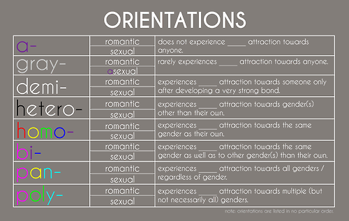 I was more afraid to answer it than I am now. I did not have a lot of experience with the other sexualities out there and believe me there are a few. We as a society are focused on a binary aspect, which really does not hold true anymore. There’s hetero-, homo-, bi-, pan-, poly-, demi-, and a-sexuality. Each has a different type of individual they are attracted to (or lack there of) sexually and/or romantically. I found this lovely little chart to go over the various orientations and romantic orientations (which yes, can be different)